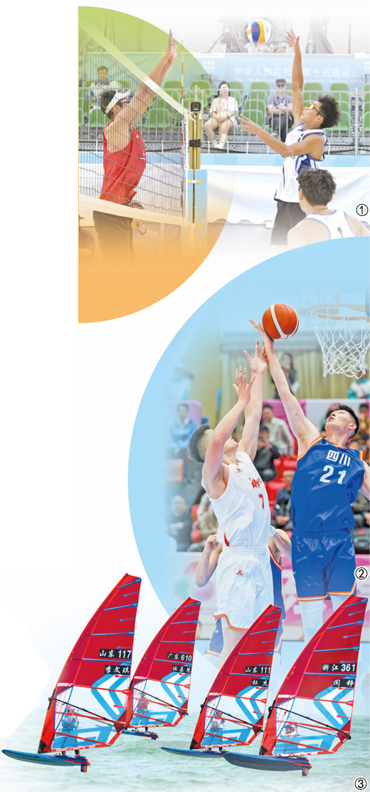图片①:香港维多利亚公园,第十五届全运会男子沙滩排球小组比赛场场爆满。卢丙辉 摄(新华社发) 图②:第十五届全运会篮球比赛...