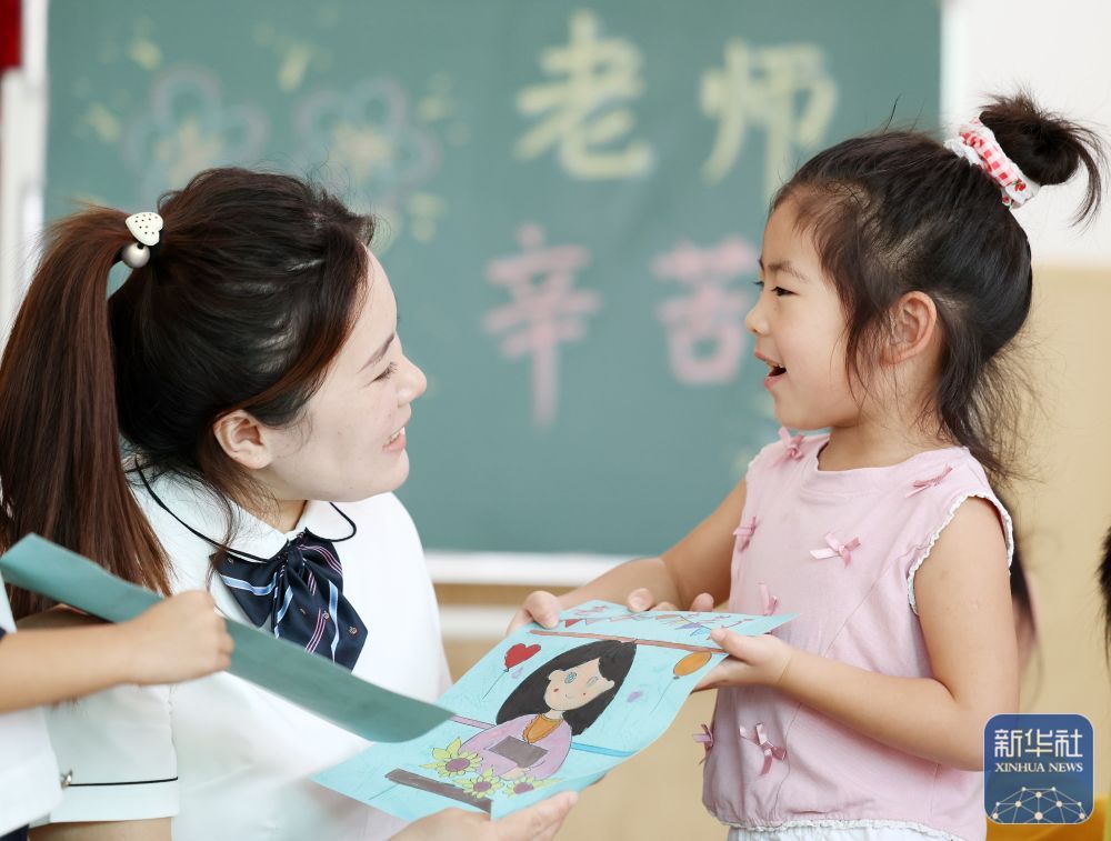 9月9日,山东省利耶市坦钦县坦观街的幼儿园关丹街的孩子们在老师的指导和协助下为老师提供了绘画。由新华社发表(张·丘莱(Zhang Chunlei)拍摄的照片)